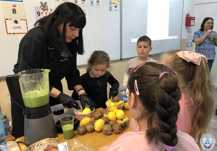 Pentru a transmite elevilor informații pe înțelesul lor despre beneficiile legumelor și fructelor, lecția de nutriție de la clasa pregătitoare a inclus nu doar explicațiile și recomandările farmacistului, ci și un videoclip muzical și o demonstrație practică de alimentație sănătoasă, oferită de o finalistă a cunoscutului show TV „Chefi la cuțite”.