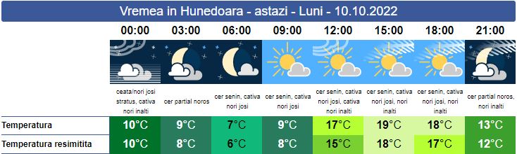 Luni, săptămâna debutează cu cer variabil. Soarele răsare la ora 07:37. Pe timpul nopții și dimineață, pe alocuri, în zonele joase va fi ceață. Pe timpul zilei se va însenina, iar din punct de vedere termic vremea se încadrează în normalul perioadei. Vântul va sufla slab și moderat cu unele intensificări în zona de sud a județului. Soarele va apune la ora 18:54. Minimele se vor încadra între 6 și 10 grade, iar maxima în jurul valorii de 19 grade.