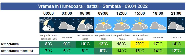 Sâmbătă, cerul va fi variabil în cea mai mare parte a intervalului. Soarele răsare la ora 06:52. Valorile termice vor fi peste normalul perioadei, iar spre seară norii vor domina cerul. Vântul va avea intensificări cu rafale în special în zonele montane și submontane. Soarele va apune la ora 20:07. Minimele zilei se vor situa între 8-10 grade, iar maximele în jurul valori de 20 grade.