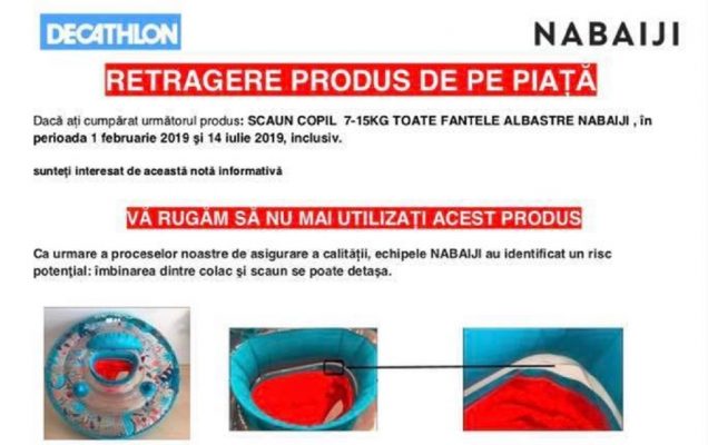 ”Ca urmare a procedurilor noastre de asigurare a calităţii, echipele Nabaiji au identificat un risc potenţial: îmbinarea dintre colac şi scaune se poate detaşa. Ansamblul se poate desface treptat şi parţial în vecinătatea scaunului sau chiar complet. Acest fenomen aleatoriu apare doar în cazuri foarte rare, cu toate acestea nu dorim să ne asumăm niciun risc în ce priveşte siguranţa utilizatorilor nostri şi de aceea retragem de pe piaţă toate produsele noastre”, a transmis, joi, Decathlon.