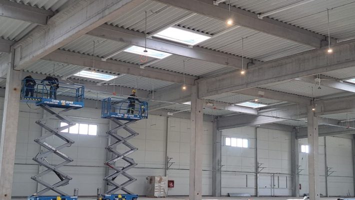 A fost finalizată pardoseala, compartimentările interioare cu panouri, hidroizolația la acoperiș. S-au montat ferestrele din aluminiu cu geam termopan, ușile metalice rezistente la foc și ușile secționale, trapele de fum, luminatoarele și hidranții.