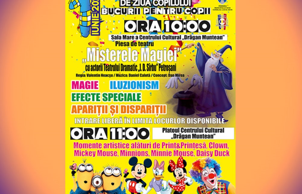 De la ora 10:00, în Sala Mare a Centrului Cultural ,,Drăgan Muntean” Deva se va juca piesa de teatru „Misterele Magiei”, un spectacol de magie, iluzionism, efecte speciale, apariții și dispariții, în regia lui Valentin Neacșu, cu actorii Teatrului Dramatic „I.D. Sîrbu” din Petroșani, pe aranjamentul muzical al lui Daniel Calotă, într-un concept semnat de actorul Dan Mirea.