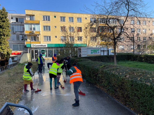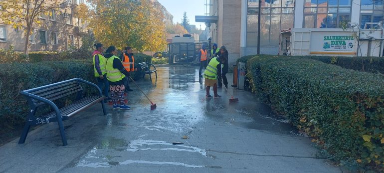 Activitățile desfășurate au inclus măturatul trotuarelor, spălarea acestora, precum și igienizarea platoului din zona Poșta Veche.