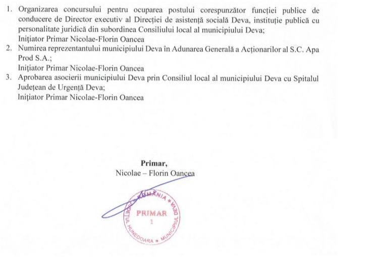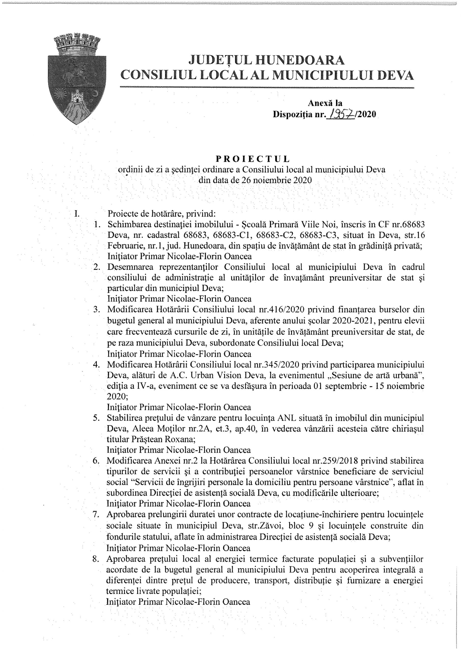 Primăria Municipiului Deva aduce la cunoștință convocarea Consiliului Local al municipiului Deva în ședință ordinară pentru joi, 26 noiembrie 2020, ora 13:00, în sala de ședințe a instituției. Şedinţa se desfăşoară cu respectarea tuturor măsurilor instituite la nivel naţional, pe perioada stării de alertă, pentru prevenirea răspândirii COVID-19.