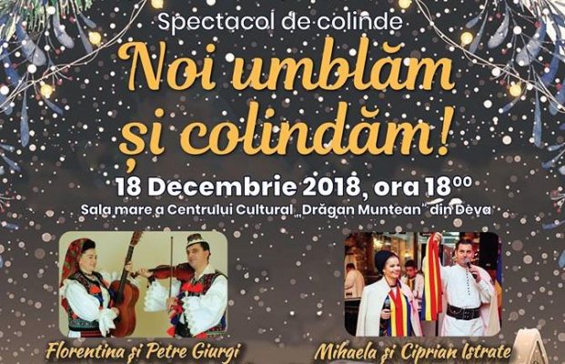 Primăria Municipiului Deva și Centrul Cultural „Drăgan Muntean” vă invită, marți, 18 decembrie 2018, la ora 18:00, la un spectacol inedit de colinde, intitulat „Noi umblăm și colindăm!”, care va avea loc în sala mare a Centrului Cultural „Drăgan Muntean” din Deva.