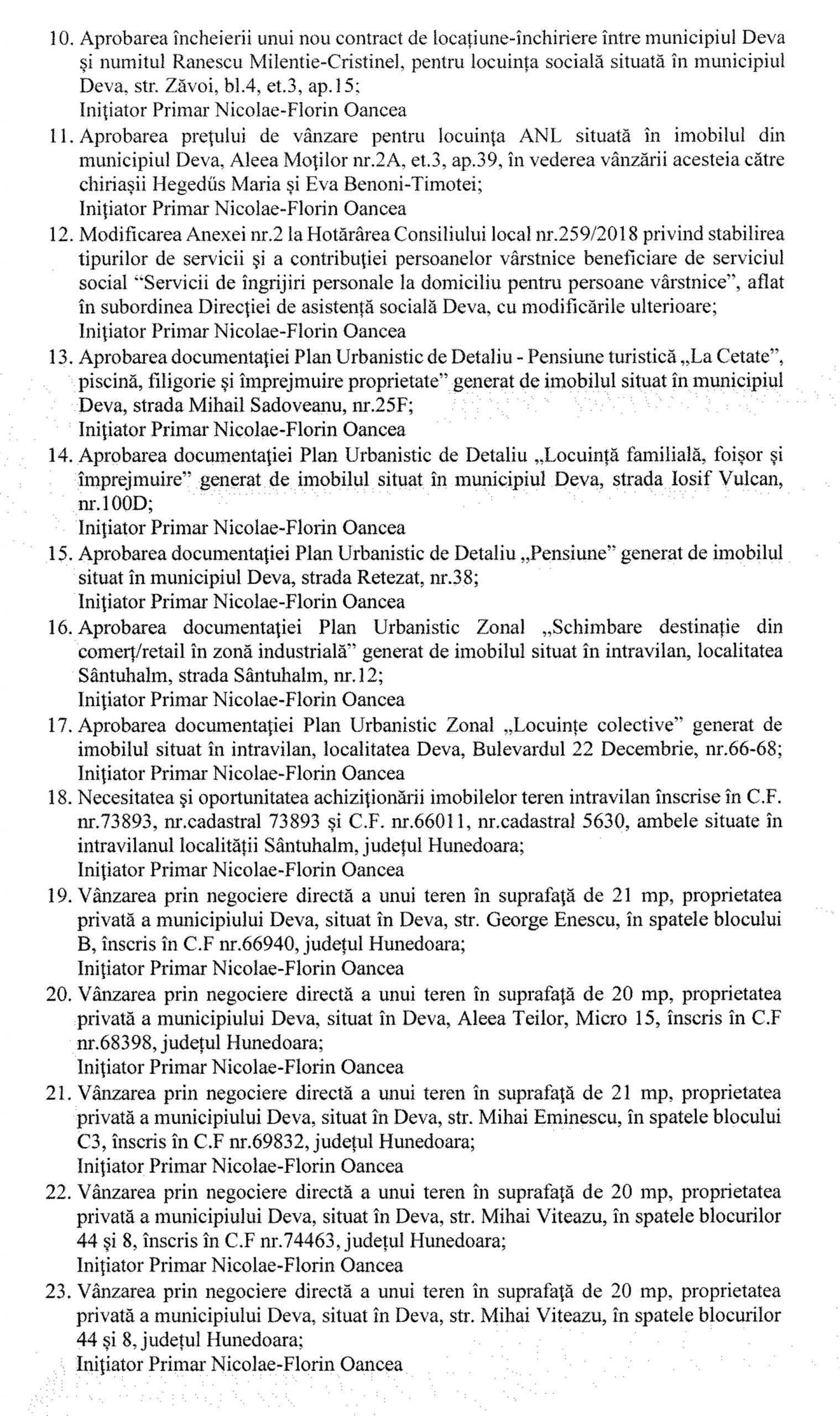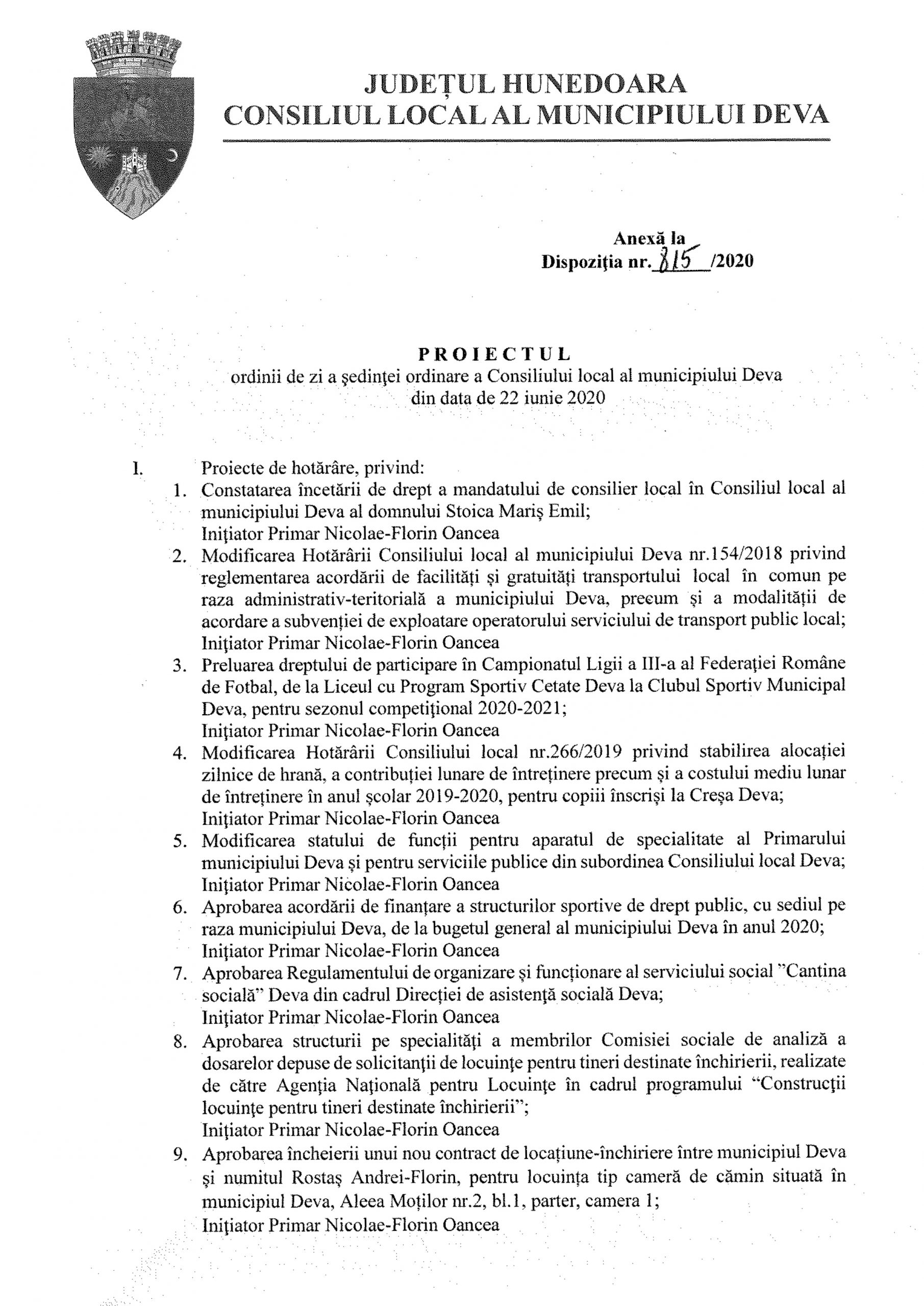 Luni, 22 iunie 2020, consilieri locali sunt convocați, la ora 12:00, într-o ședință de tip videoconferință pentru a supune la vot următoarele hotărâri de pe ordinea de zi: