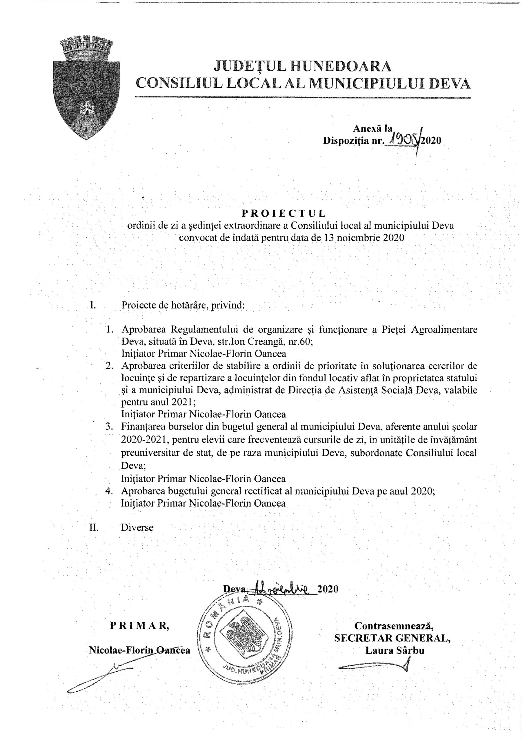 Vineri, 13 noiembrie 2020, ora 13:00, se va desfășura ședința extraordinară a Consiliului Local al municipiului Deva. Pe ordinea de zi vor fi supuse atenției patru proiecte de hotărâre. Iată care sunt acestea: