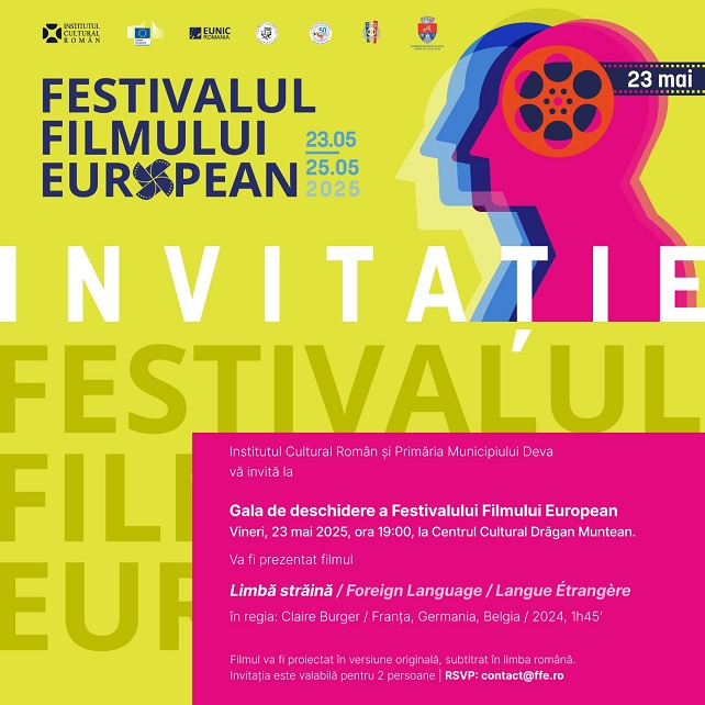 Institutul Cultural Român, Primăria Municipiului Deva și Centrul Cultural ,,Drăgan Muntean” au plăcerea de a vă invita la Gala de deschidere a Festivalului Filmului European, ce va avea loc vineri, 23 mai 2025, ora 19:00, în sala mare a Centrului Cultural „Drăgan Muntean” din Deva.