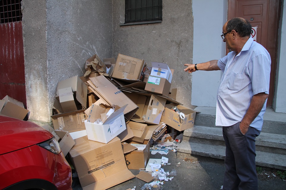 „De la primărie mi-au trimis la operatorul de salubritate, cei de la Salubritate mi-au spus că ei strâng doar gunoiul menajer şi nu cartoanele. Ba chiar au venit şi au pus lăcate la ghene ca să nu mai poată intra unul – altul. Am sunat la poliţia locală, mi-au dat pe cineva de la un compartiment de mediu şi omul mi-a spus că ar fi bine să-i fac fotografii la făptuitor ca să ştie la cine să dea amenzi”, explică bărbatul.