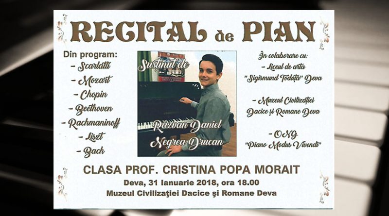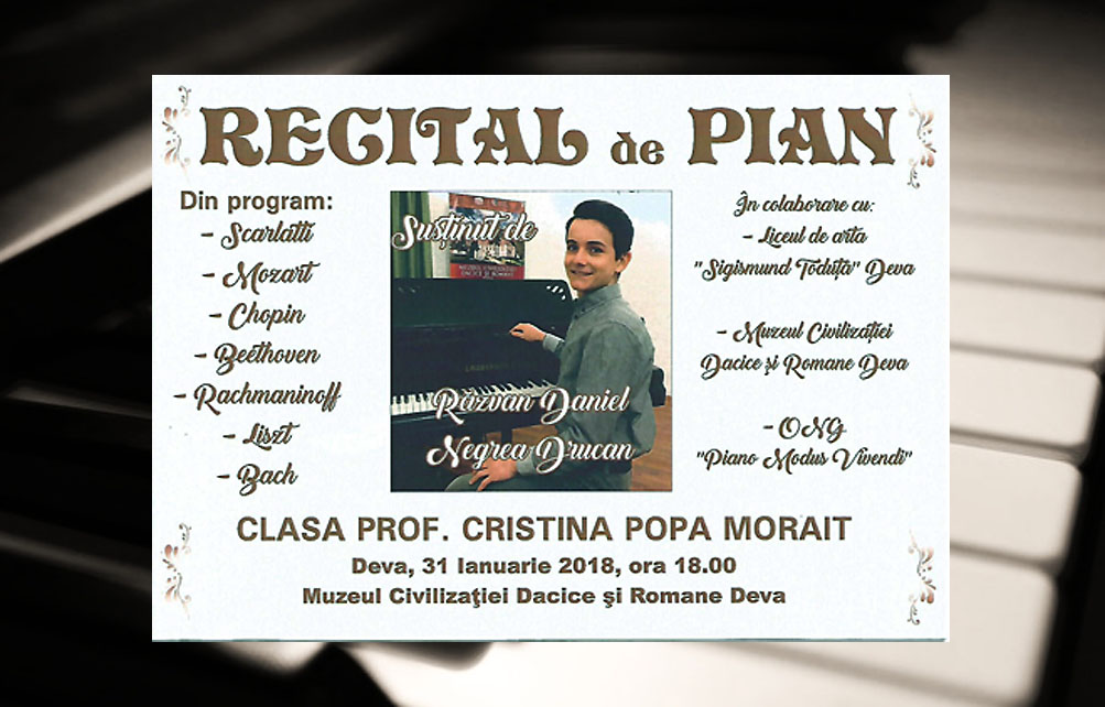 Miercuri, 31 ianuarie 2018, ora 18.00, la Sala Şemineului din incinta Muzeului Civilizaţiei Dacice şi Romane din Deva, va avea loc un recital pianistic susţinut de elevul Răzvan Daniel Negrea-Drucan din clasa a VIII-a muzică, Liceul de Arte „Sigismund Toduţă”-Deva, clasa profesor Cristina Popa-Morait.