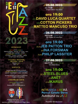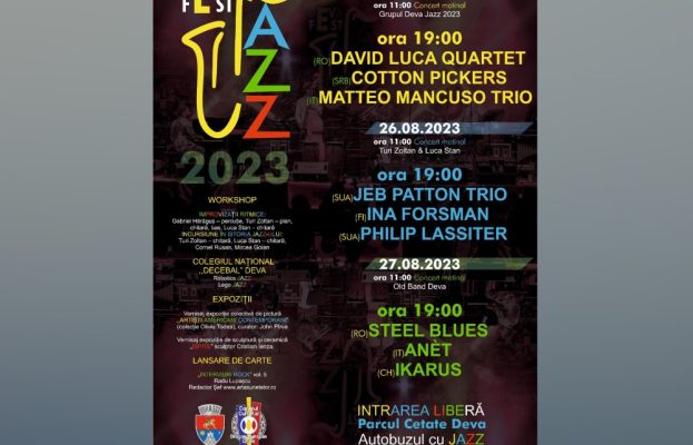 Primăria Municipiului Deva și Centrul Cultural „Drăgan Muntean” Deva vă invită la a șasea ediție a Deva Jazz Fest, în perioada 25-27 august 2023, în Parcul Cetate din Deva.