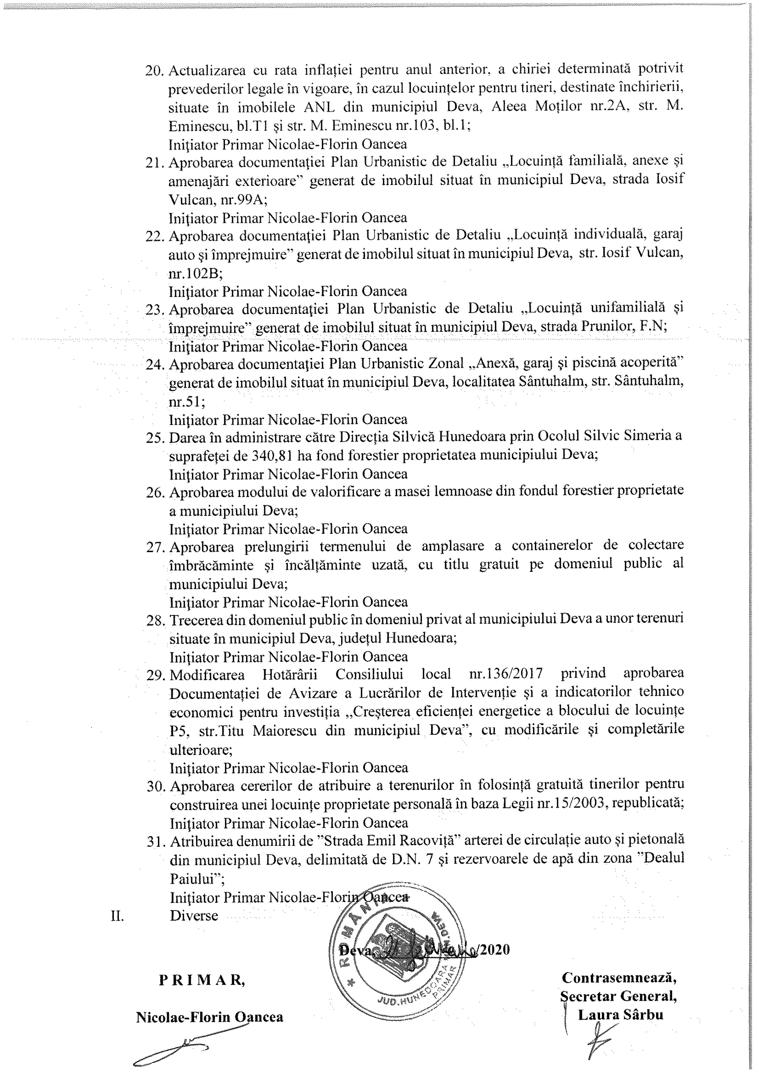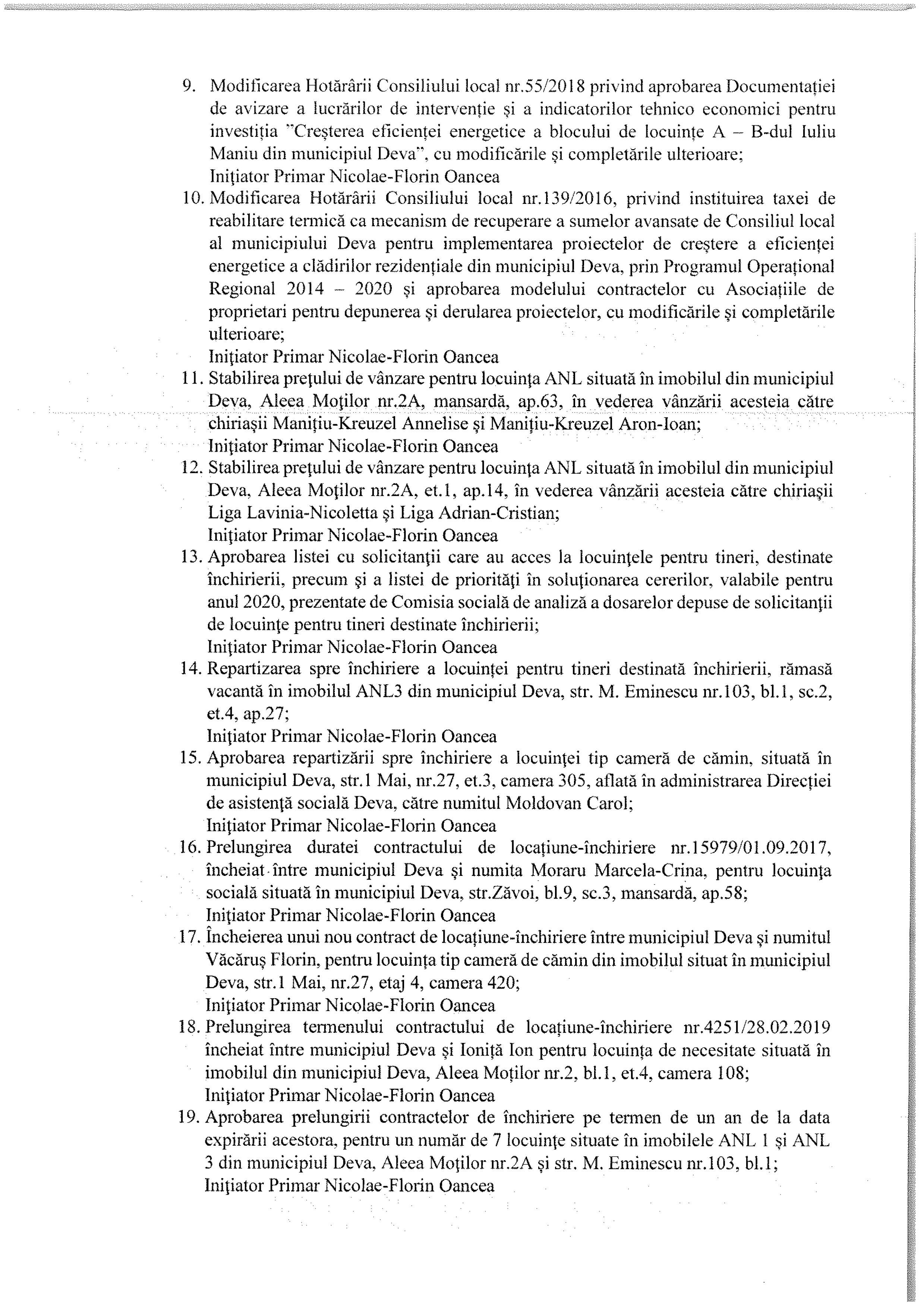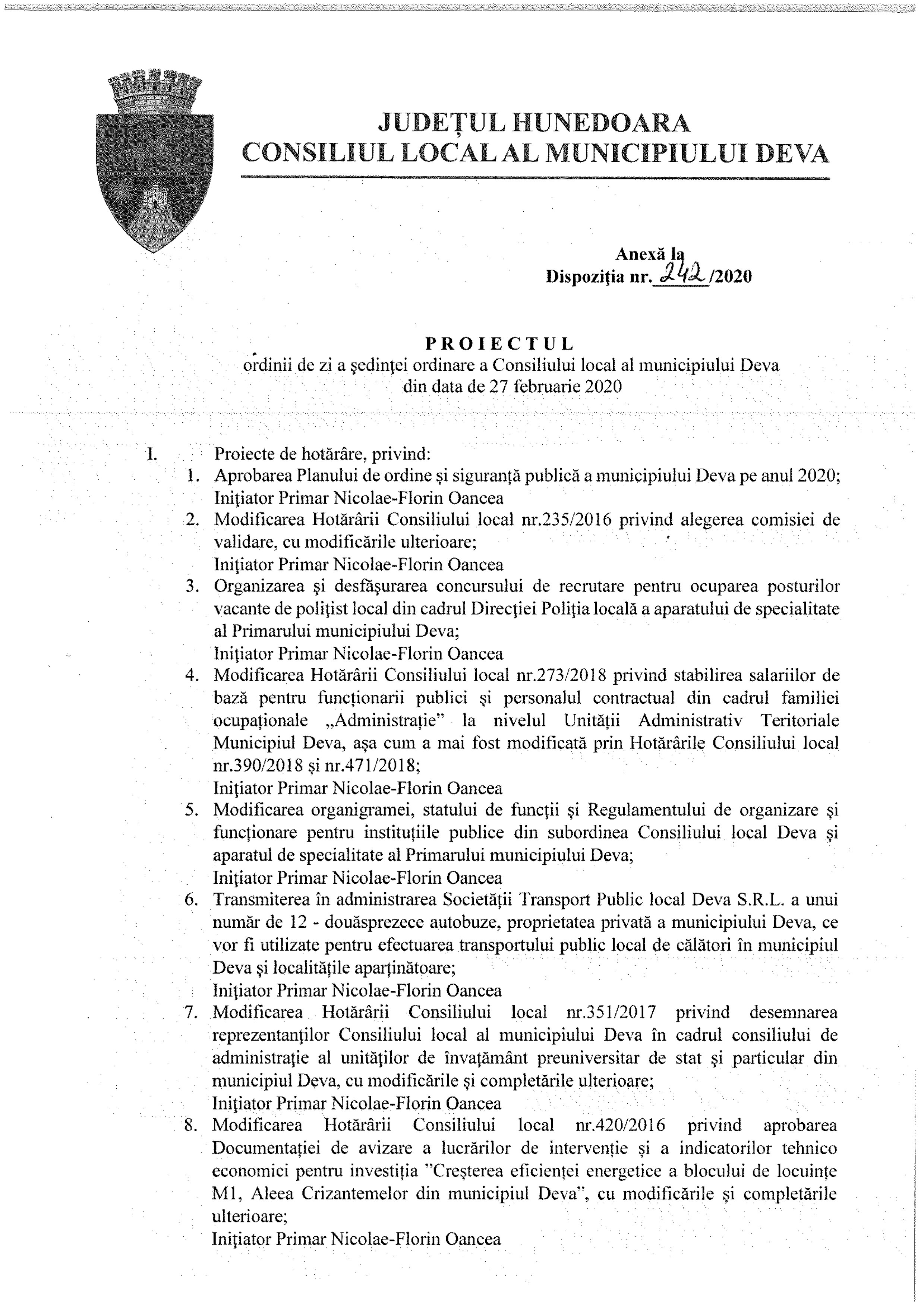 Primăria Municipiului Deva vă invită, joi, 27 februarie 2020, la ora 11:00, la ședința ordinară a Consiliului Local Deva, care va avea loc în sala de ședințe a instituției (etajul I). Aleșii locali vor trebui să dezbată cele 31 de hotărâri de pe ordinea de zi, care se regăsește aici: