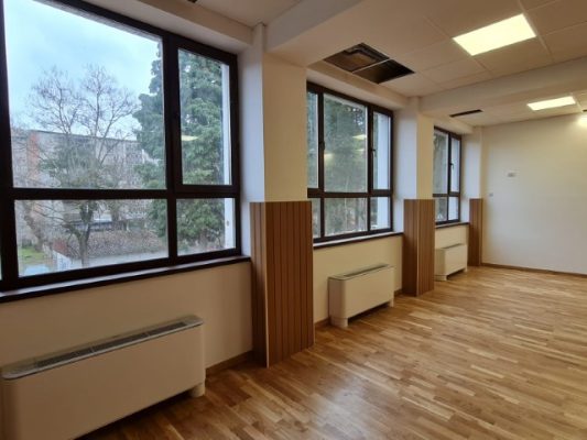 Și la această clădire au fost montate geamurile și ușile de interior, ușile exterioare de aluminiu cu geam termopan, balustradele metalice pe holuri, tablourile electrice și s-au realizat cablajele pentru curenți slabi (incendiu, efracție, voce-date, supraveghere video, BMS, control acces).