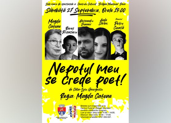 Primăria Municipiului Deva și Centrul Cultural ,,Drăgan Muntean” vă invită sâmbătă, 27 septembrie 2025, ora 19:00, la spectacolul „Nepotul meu se crede poet”, o comedie savuroasă și inteligentă, regizată de Magda Catone, după un text semnat de Călin-Liviu Georgescu. Evenimentul este organizat de S.C. Spectatour S.R.L. din Constanța.