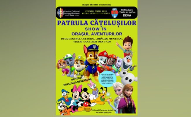 Primăria Municipiului Deva şi Centrul Cultural „Drăgan Muntean” Deva vă invită vineri, 4 octombrie 2024, la ora 17:00, în Sala Mare a Centrului Cultural „Drăgan Muntean”, la spectacolul ,,Patrula Cățelușilor în Orașul Aventurilor”, organizat de Magic Theatre Constassiny din Galați.