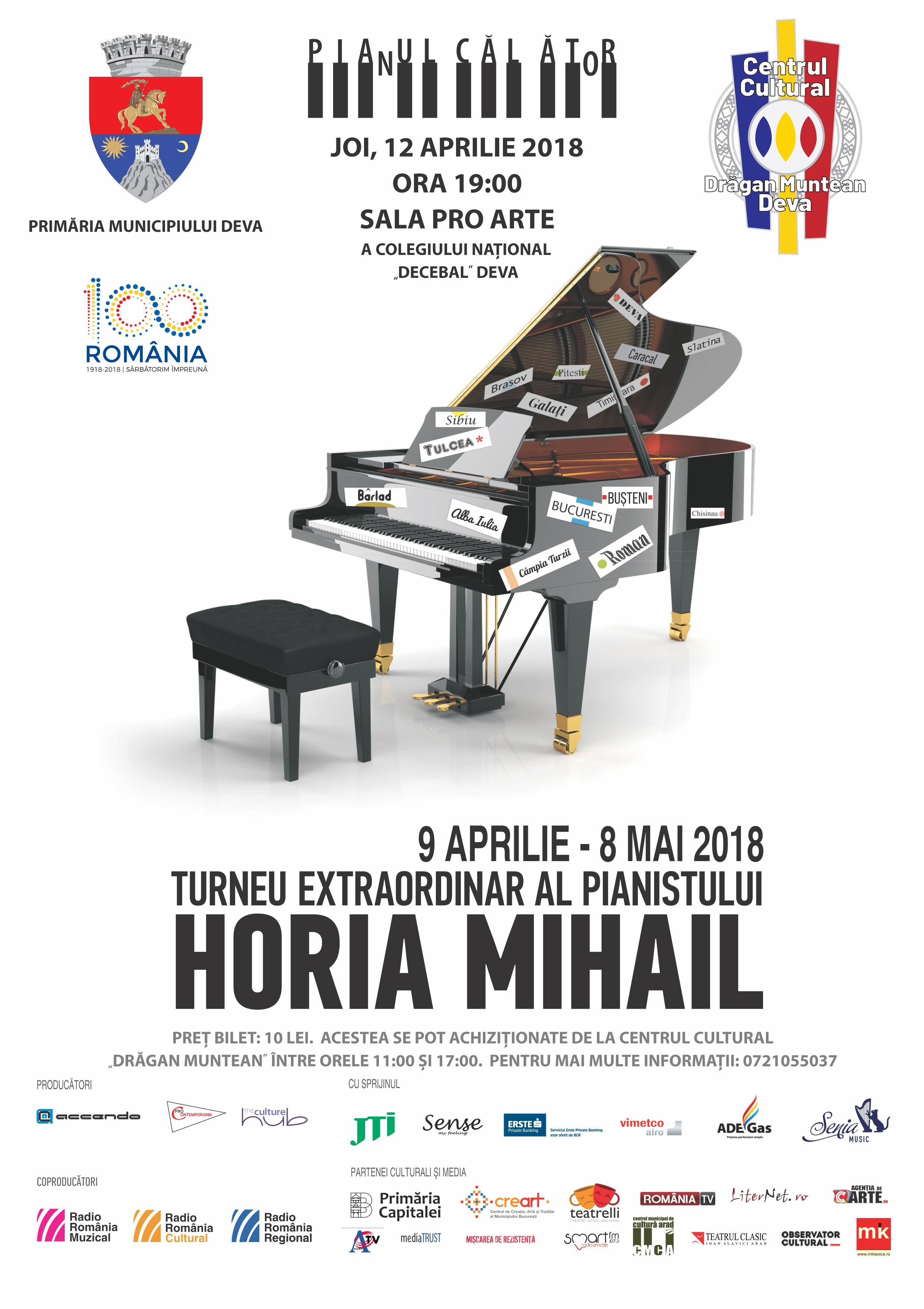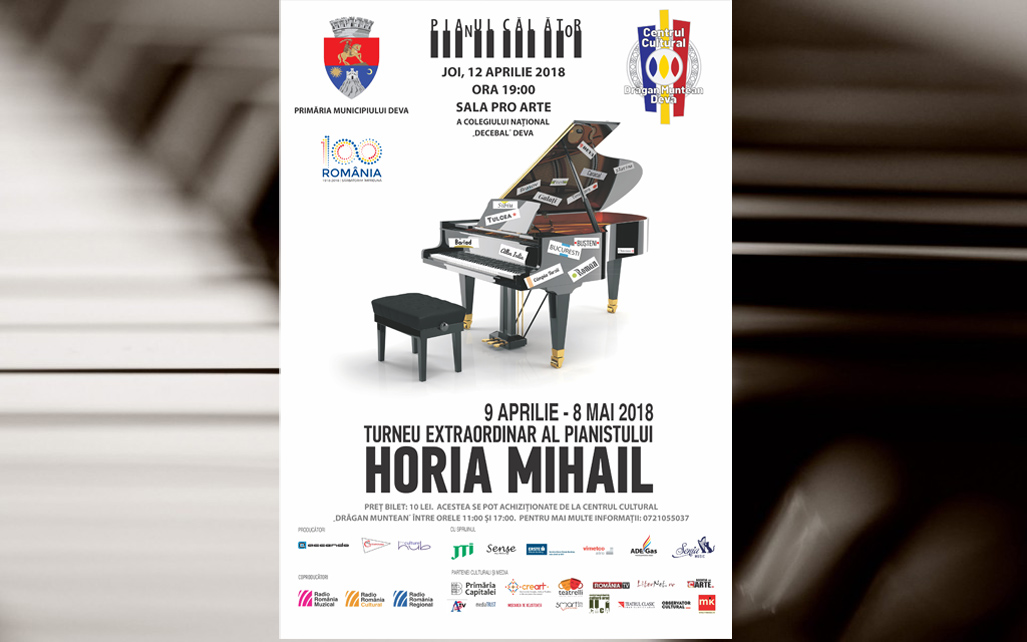 Primăria Municipiului Deva și Centrul Cultural ”Drăgan Muntean” vă invită, joi, 12 aprilie 2018, la ora 19:00, la un recital ”Pianul călător”, susținut în cadrul turneului extraordinar al pianistului Horia Mihail.