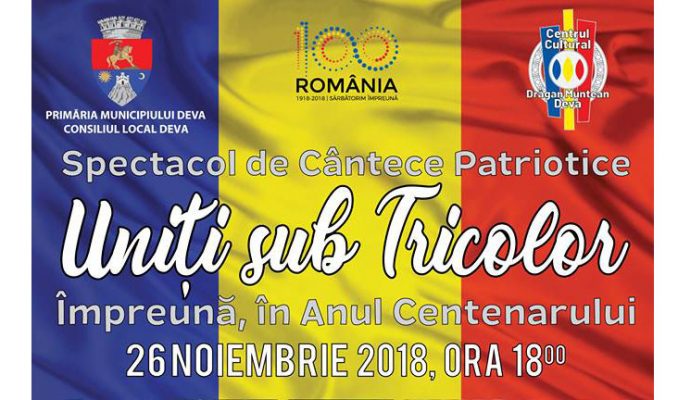 Primăria Municipiului Deva și Centrul Cultural ”Drăgan Muntean” vă invită, luni, 26 noiembrie 2018, la ora 18:00, la spectacolul de cântece patriotice ”Uniți sub Tricolor”, care va avea loc în sala mare a Centrului Cultural ”Drăgan Muntean” din Deva.