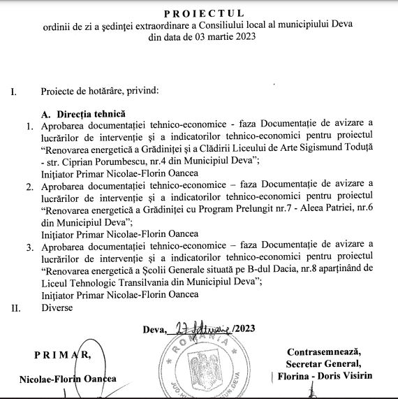 Primăria Municipiului Deva aduce la cunoștință convocarea Consiliului Local al Municipiului Deva în ședință extraordinară pentru vineri, 3 martie 2023, ora 11:00, în Sala mare de ședințe a instituției