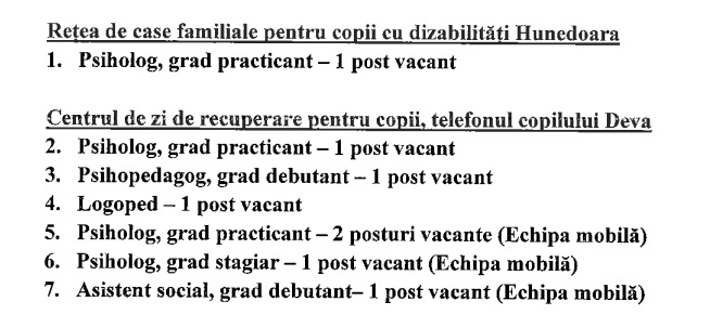 Direcția Generală de Asistență Socială și Protecția Copilului Hunedoara organizează concurs de recrutare pentru ocuparea pe perioadă nedeterminată, a funcțiilor contractuale de execuție, vacante.
