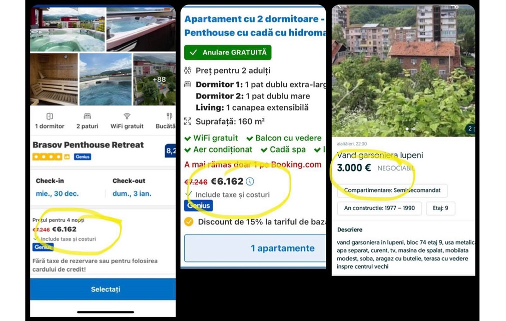 ”4 nopți de Revelion in Poiana Brașov fac cât două garsoniere scoase la vânzare in centrul orașului Lupeni. Despre asta e Romania: amărâții din Lupeni si barosanii din Poiană… Turismul românesc îmi face concurență de Revelion: 1 apartament, 2 dormitoare pentru 2 adulți: 6162 euro cu reducere de la 7246 euro! (șase mii euro). Și grăbiti-vă, se dă! Booking zice că a mai rămas doar o cameră! 6126 de euro în 4 zile însemnă vreo 64 euro/oră. Am găsit și o garsonieră în centrul orașului Lupeni, ăla care avea minerit cândva. 3000 euro e garsoniera acolo.