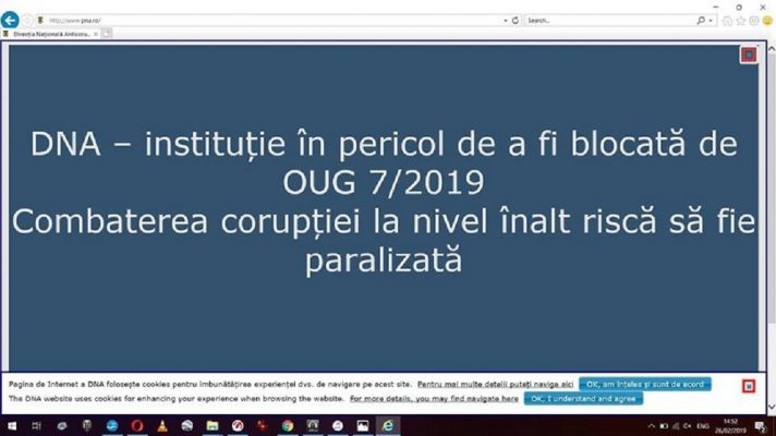 De altfel, pe pagina de internet a instituţiei este postat mesajul „DNA – instituţie în pericol de a fi blocată de OUG 7/2019. Combaterea corupţiei la nivel înalt riscă să fie paralizată”.