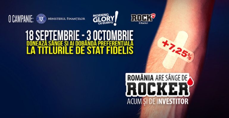 Ministerul Finanţelor lansează a treia ediţie din 2023 a campaniei „România are sânge de rocker”, iniţiată de Morning Glory, Rock FM, cu sprijinul Centrului de Transfuzie Sanguină Bucureşti, prin intermediul Programului de titluri de stat FIDELIS şi le acordă donatorilor de sânge o dobândă specială. Perioada de desfăşurare este 18 septembrie – 3 octombrie.
