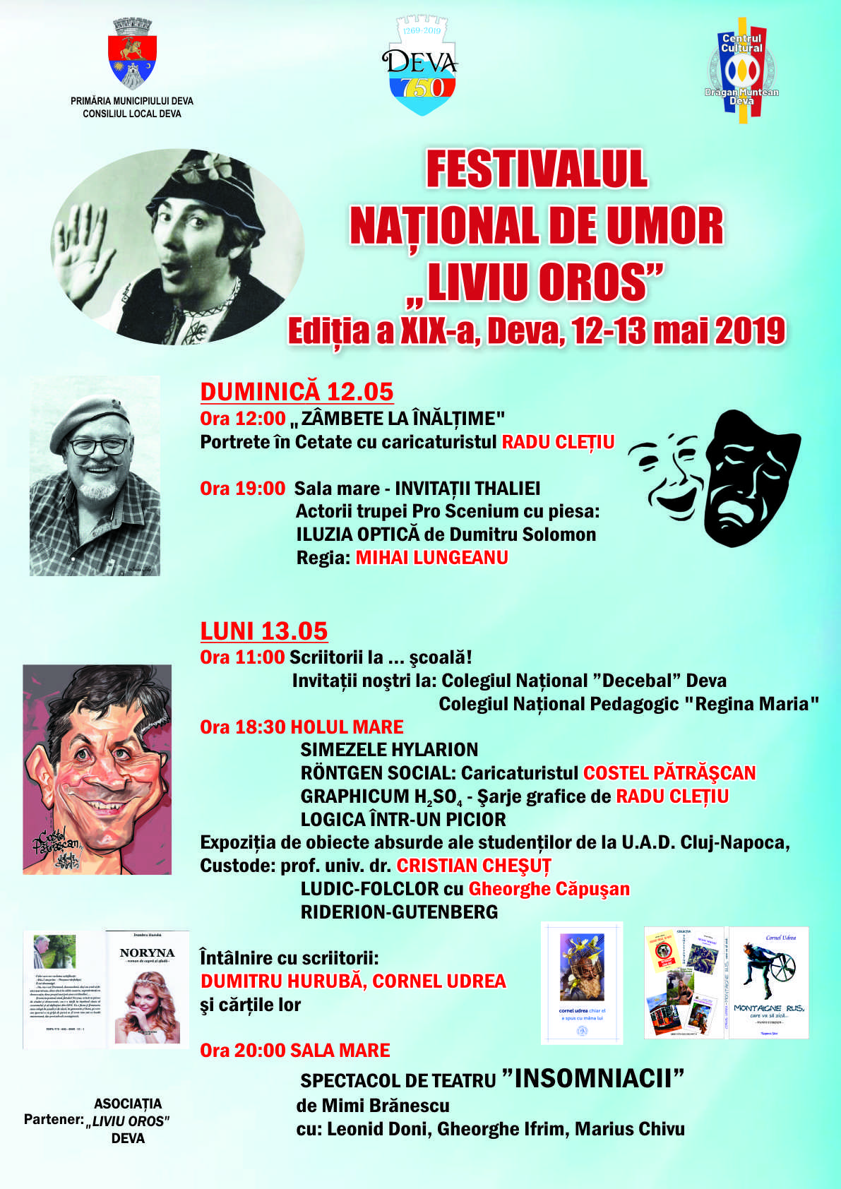 Salon de caricatură, şarje grafice, portrete în Cetatea Deva, expoziţie de obiecte absurde, spectacole de teatru, întâlniri cu scriitorii, ludic folclor și prezentări de carte umoristică sunt doar câteva dintre manifestările ce vor avea loc, timp de două zile, la Deva, în cadrul Festivalului Naţional de Umor „Liviu Oros” – ediţia a XIX-a, care se desfăşoară duminică și luni, 12 şi 13 mai 2019, la Centrul Cultural „Drăgan Muntean” Deva.