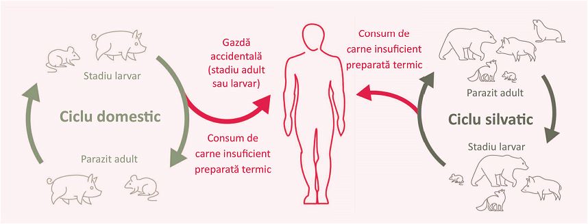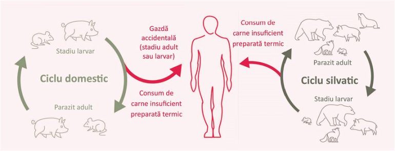Trichineloza este o infecție parazitară care se transmite exclusiv prin consumul de carne infestată, crudă sau insuficient preparată termic. În gospodării, riscul cel mai mare provine de la porcii sacrificați fără efectuarea testului trichineloscopic, o analiză rapidă și obligatorie înainte de consum, precum și de la carnea de vânat neverificată.