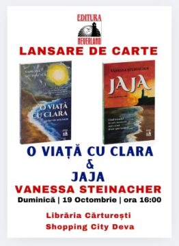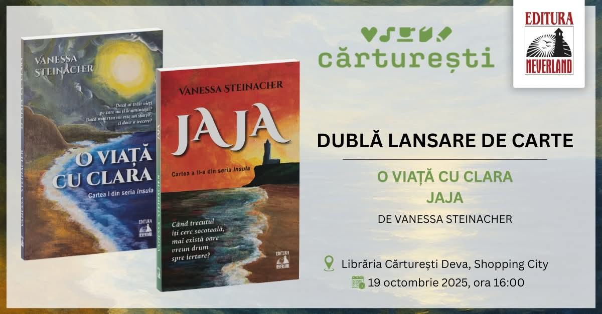 Autoarea Vanessa Steinacher revine, duminică, la Deva, pentru o dublă lansare de carte. După ce ne-a cucerit, în 2012, cu „Imagini de Fado”, romanciera va prezenta publicului, de la ora 16, la Librăria Cărtureşti Deva cele două volume ale seriei „Insula” intitulate „O viaţă cu Clara” şi „Jaja”, apărute la editura Neverland.