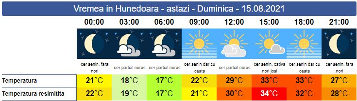 Duminică, cerul va fi variabil, iar temperaturile în creștere. Soarele va răsări la ora 06:26, va trece prin ceață și prin perioade cu nori. Începând de după-amiaza zilei se va instala canicula, iar disconfortul termic va fi accentuat. Vântul va sufla slab. Soarele va apune la ora 20:39. Valorile minime se vor încadra între 17 și 18 grade, iar maxima se va situa în jurul temperaturii de 34 de grade.
