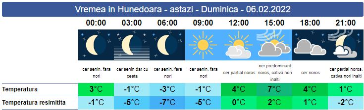 Vremea caldă se menține. Soarele răsare la ora 07:42. Pe timpul nopții și până spre amiaza zilei cerul va fi senin apoi, atmosfera se va înnora treptat. La sfârșitul intervalului, la munte se anunță ninsori. Vântul va sufla slab și moderat, cu intensificări la munte. Soarele va apune la ora 17:42. Temperaturile minime vor fi cuprinse între -3 și -1 grad, iar maximele vor urca în jurul valorii de 7 grade.