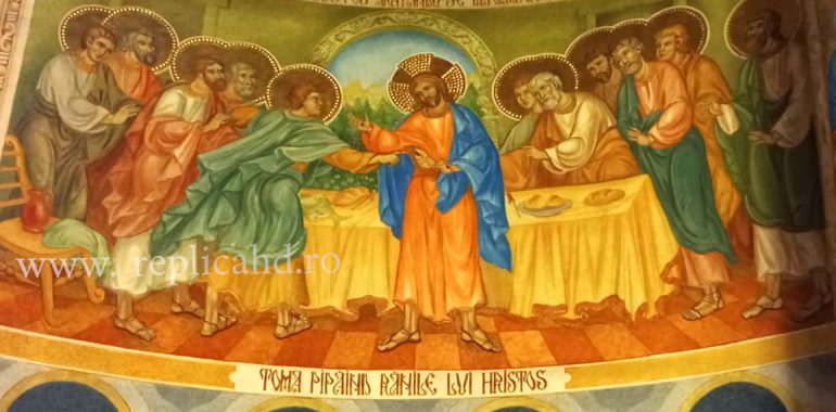 Evanghelia acestei Duminici își începe lectura cu o săptămână înainte. Odată cu Duminica Învierii citim o primă parte – Ioan 20, 19- 25. Se închide parabola Învierii cu o altfel de îndoială decât a celor care credeau că i-au pus capăt propovăduirii Domnului, cu îndoiala dată de uimire. Acel „nu cred” pe care îl auzim deseori când dăm o veste bună. E uimirea care e luminată de speranță. Nu cea cârcotașă, care se miră fără bucurie, fără să înțeleagă împlinirea așteptării. Toma Geamănul e un „întârziat” la marea Întâlnire din Foișorul cu uși trecute de Hristos fără să le strice. Nu i se vorbește de către Înviat, ci de martorii Lui. Toma și să-i creadă nu-i vine a crede – iertat fie-mi jocul de cuvinte – pentru că bucuria speranței lui dublată de o infinită dragoste pentru Iisus Hristos îi obligă firea să ceară argument. Iar argumentul e Domnul Cel Înviat.