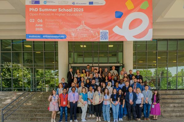 Universitatea Politehnica Timișoara a găzduit prima ediție a E³UDRES² – Ent-r-e-novators PhD Summer School 2025 – Open Practices in Higher Education, eveniment care a reunit, fizic și online, o comunitate academică vibrantă: peste 70 de studenți doctoranzi și tineri cercetători din 22 de țări (România, Portugalia, Italia, Belgia, Letonia, Ungaria, Olanda, Austria, Kenya, Germania, Pakistan, Filipine, Ucraina, Grecia, Sri Lanka, Bangladesh, Iran, India, Indonezia, Siria, Ecuador și Maroc).