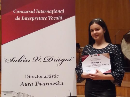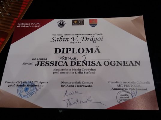 Astfel, eleva Jessica Ognean -clasa a XI-a Muzică, specialitatea canto clasic, clasa prof. Maria Copăcian și acompaniată la pian de prof. corepetitor Delia Ștefoni- a obținut Premiul I la Concursul Internațional de Interpretare Vocală Sabin V. Drăgoi, Ediția a X-a, secțiunea Young Sabin V. Drăgoi (adresată elevilor liceeni) – Ediția I.