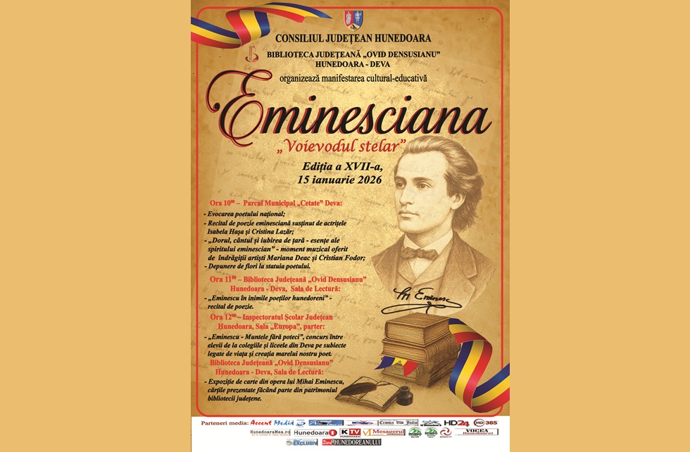 Poetul nostru național, reper fundamental al spiritualității românești, va fi omagiat printr-o manifestare culturală specială, organizată cu sprijinul generos al Consiliului Județean Hunedoara.