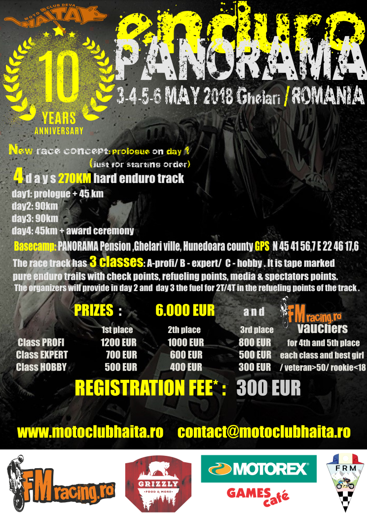A început numărătoarea inversă pentru ediţia aniversară a competiţiei Enduro Panorama. Evenimentul se desfăşoară între între 3 şi 6 mai în Ţinutul Pădurenilor. În 2018, organizatorii de la Moto Club Haita Deva îi provoacă pe pasionaţii de enduro cu patru zile de competiţie şi 270 de km de traseu hard enduro.