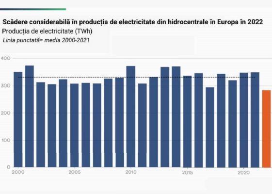 „Astfel, energia hidro generată în UE a scăzut cu 66 TWh faţă de 2021. În Ruopean Electricity Review 2023 lansat de EMBER, se arată că producţie de energie din hidro a scăzut de la 349 TWh (2021) la 283 TWh (2022)”, a mai precizat organizaţia.