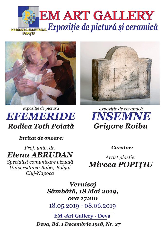 Cea mai cochetă galerie de artă din centrul istoric al Devei, EM Art Gallery din Deva, va fi gazda unei expoziții inedite de pictură și ceramică, deschisă publicului în perioada 18.05-08.06.2019. Vernisajul expoziției va avea loc, sâmbătă, 18.05.2019, începând cu ora 17:00. Invitați vor fi doi artiști deosebiți, membrii ai UNAP din România, pictorița Rodica TOTH POIATĂ și artistul plastic, prof. Grigore ROIBU.