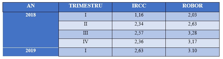 O privire retrospectivă relevă că IRCC a avut permanent o valoare mai mică decât ROBOR. De exemplu, raportat la anul 2018, situația pe trimestre se prezintă astfel: