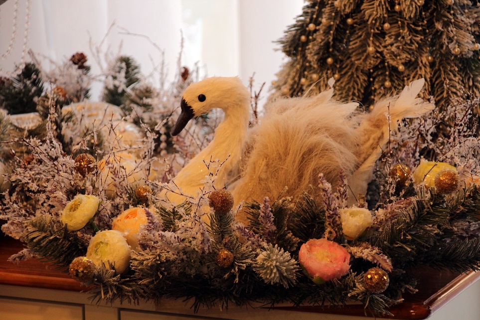 La masa din centrul salonului, Dana lucrează la un aranjament cu o lebădă maiestuoasă străjuită de rămurele înzăpezite între care câteva flori fine, care amintesc de bujor, adaugă tonuri calde de corai, crem și gălbenuș: „Aici pregătesc un cuib pentru lebădă, cu floare de ranunculus, care îmi place mie foarte mult pentru că este foarte delicată, cu fire de lavandă care pare îngheţată așa, odată decorată cu flori de gheaţă.