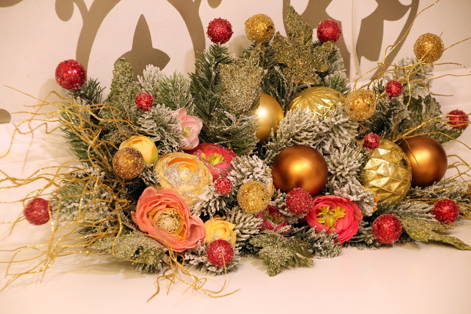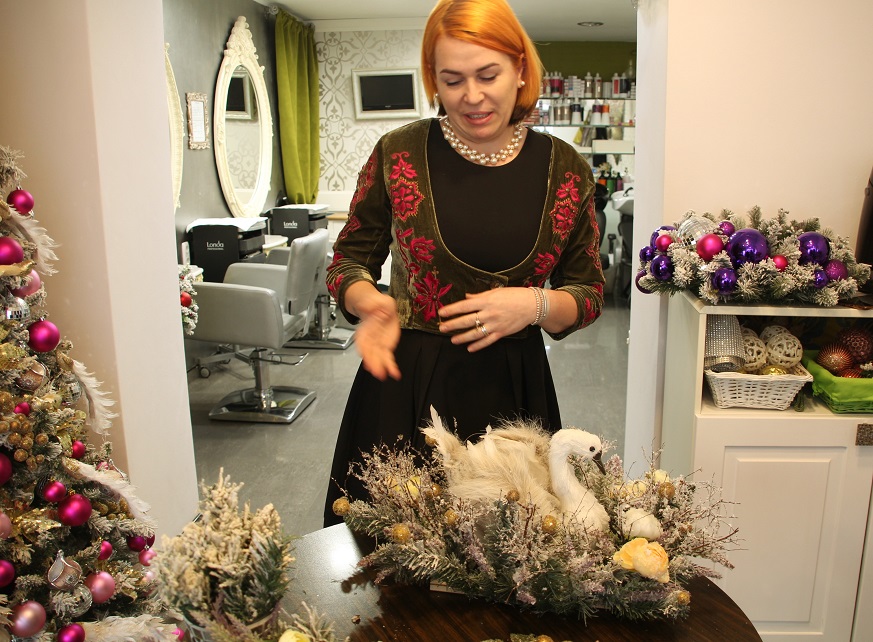 Te-ai aștepta ca într-un salon de coafură să miroase aspru a vopsele, amoniac și fixativ, însă spațiul e cucerit de aroma de brad. Dintre toate simțurile, văzul este cel răsfățat în spațiul transformat acum în atelier de Crăciun. Din fiecare colț, altă minunăție îți atrage atenția. Nici unul dintre aranjamente nu seamănă cu cel de alăturea, dar toate sunt realizate somptuos și în fiecare piesă recunoști stilul elegant și grija pentru detalii care au dus faima hunedorencei.