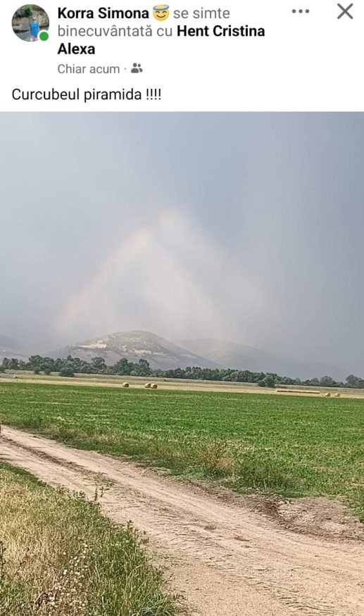 Curcubeul avea forma unui triunghi, ba, mai mult, la un moment dat, s-a dublat şi în spatele lui a apărut o formă asemănătoare. „Arată ca piramidă”, a şoptit mama fetei, Simona Kora.