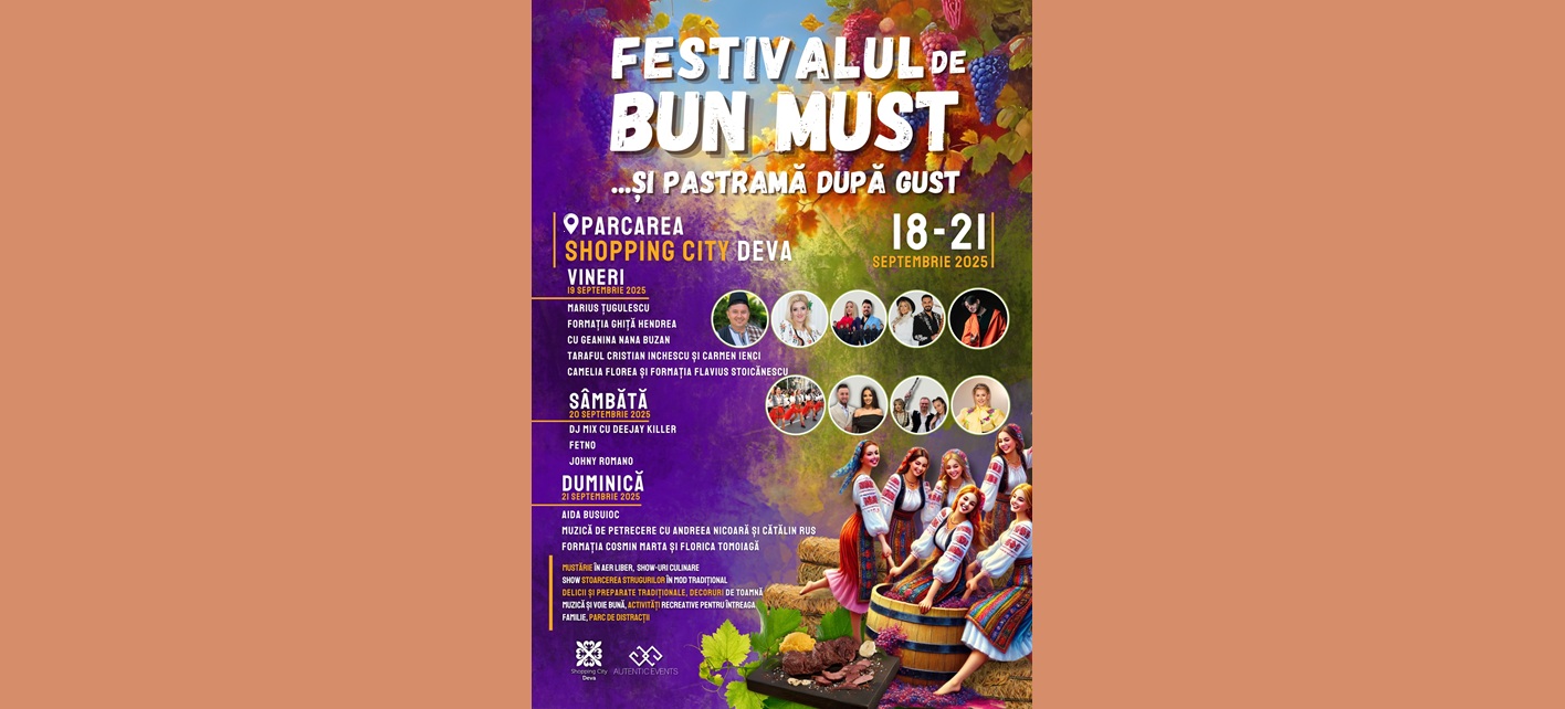 Între 18 și 21 septembrie 2025, parcarea Shopping City Deva se transformă într-un colț de sat românesc, cu bucate alese, tradiții vii și distracție pentru toate vârstele.