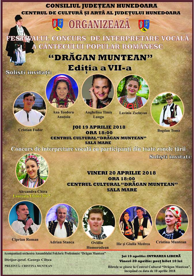 Festivalul concurs de interpretare vocală a cântecului popular românesc „Drăgan Muntean” va avea loc la Deva în zilele de 19 și 20 aprilie.