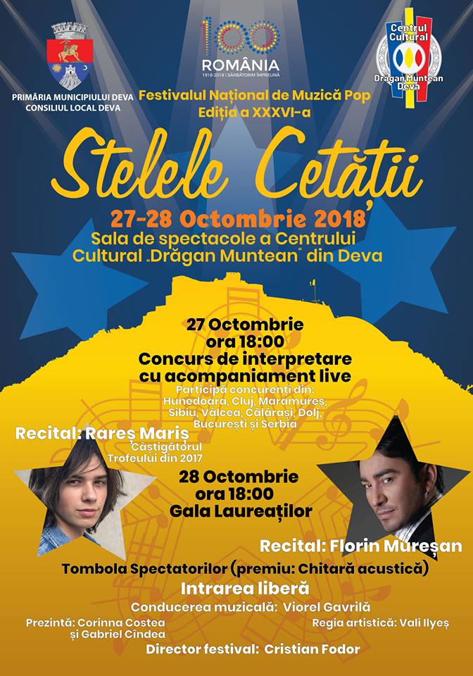 15 finaliști din șapte județe și municipiul București, precum și din Serbia vor intra în concurs la Festivalul Național de Muzică Pop ”Stelele Cetății” – ediția a XXXVI-a, care se desfășoară în zilele de 27 și 28 octombrie 2018, la Centrul Cultural ”Drăgan Muntean” Deva.
