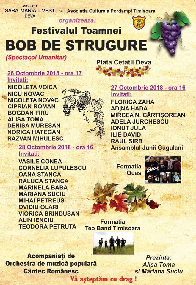 Festivalul Toamnei „Bob de Strugure” se desfăşoară în perioada 26-28 octombrie 2018, în Piaţa Cetăţii, din Deva şi va aduce pe scenă 30 de artişti şi trupe cunoscute, printre care Nicoleta Voica, Nicu Novac, Florica Zaha, Ciprian Roman, Ovidiu Olari, Alisa Toma şi formaţiile Teo Band şi Quas. Acompaniamentul este asigurat de Orchestra de Muzică Populară „Cântec Românesc”.