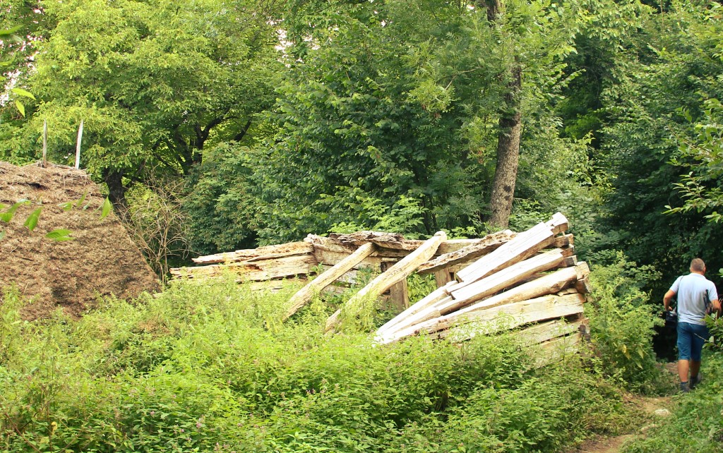Noi, cu aparatele, trepiedele şi ruscacii transpirăm la vale şi deja ne ia cu jale când ne gândim că e musai să urcăm apoi, înapoi, muntele. De-a stânga şi de-a dreapta, o mulţime de căsuţe se năruie cu lemnele putrede sau rezistă greu cu ferestrele încărcate de pânze de păienjeni.