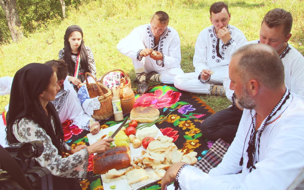 Lângă pâinea proaspătă şi rumenită, din coşuri, apar bucăţi de brânză, slănină, roşii şi ceapă. O sticlă cu ţuică e aşezată deoparte lângă alte câteva aburinde, cu apă rece. Când totul e gata, Rodica Dan ridică vocea după cosaşi: „No, hăidaţ’ să mâncaţ!!”