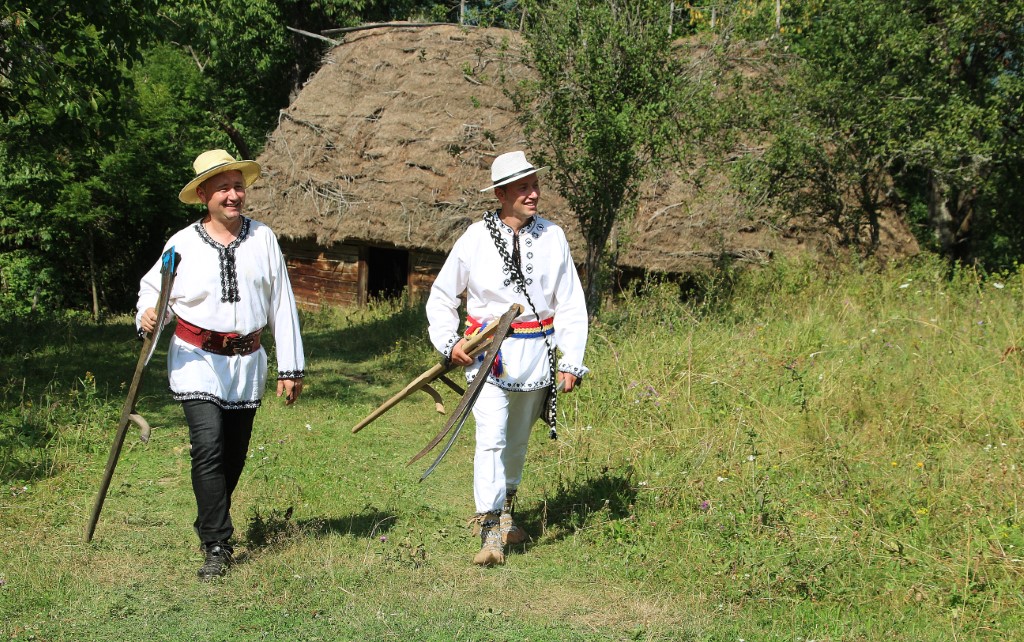Lăsăm plăcintele şi urcăm greoi poteca către culmea cu fânaţe. Oamenii nu pornesc lucrul până nu se îmbracă în straie, îşi pun opincile, aşează pălăriile de paie peste creştete.
