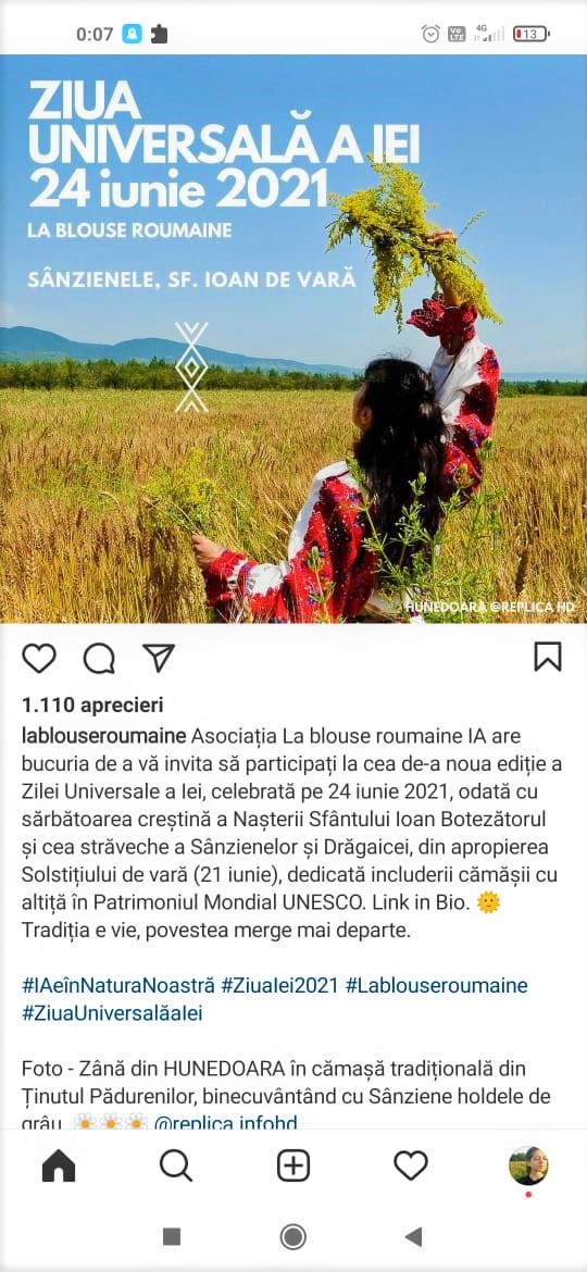 “M-am trezit luni de dimineață, spune colega noastră, jurnalista Ada Beraru, în 15 iunie, că o prietenă din Sibiu îmi face un print-screen cu fotografia făcută de fostul coleg și mereu prieten, Remus Suciu, în care apăream cu un costum pădurenesc, în câmpurile de grâu din zona Țării Hațegului, și mă anunță că Asociația <LA BLOUSE ROUMAINE> a folosit imaginea REPLICA HUNEDOARA pentru a promova ediția 2021 a Zilei Internaționale a Iei. <Zână din Hunedoara, în cămașă tradițională din Ținutul Pădurenilor, binecuvântând cu sânziene holdele de grâu.> Așa scria la explicația foto. Nu mă întrebase nimeni, nimic. Nu știam despre acest lucru. Ce știam era că fondatorii “LA BLOUSE ROUMAINE” au fost implicați în susținerea artiștilor populari din Țara Beiușului, prin campania <Bihor, nu Dior>, după ce un cojocel de inspirație românească a fost vândut de casa de modă Christian Dior cu 35.000 de dolari, dar nicăieri nu a fost menționată sursa de inspirație, deși acest lucru ar fi adus un mare plus României, la capitolul imagine. Trebuie să amintesc aici că au fost ani mulți în care jurnaliștii REPLICA HUNEDOARA au cutreierat satele hunedorene în căutare de oameni și tradiții minunate, care, încet-încet intră în uitare… Iar în acea zi, acum 5 ani, ieșisem cu Remus Suciu în Țara Hațegului, la un alt reportaj, care ne-a dus, în cele din urmă până la Fundătura Ponorului… Aveam costumul pădurenesc la mine și, pentru că se apropiau Sânzienele, l-am rugat să-mi facă vreo câteva fotografii, să avem ilustrații pentru un viitor reportaj. A doua zi după ce Ana, din Sibiu, mă anunțase referitor la preluarea imaginii, marți la prima oră, alt mesaj, de această dată de la Roxana, o prietenă din Timișoara: <Ada, ai văzut că LA BLOUSE ROUMAINE a preluat fotografia voastră??!!> Toate cămășile populare românești au farmecul lor, dar costumul pădurenesc are o frumusețe și o vitalitate aparte, dată (și) de culoarea cusăturii (pe lângă accesoriile nelipsite) care, în cazul tinerelor fete, este, întotdeauna, roșu. Doar femeile <iertate> de Dumnezeu, cele ajunse la o vârstă mai înaintată, pot să poarte negru, alături de înflorituri… violet, de pildă. Sânzienele e o sărbătoare pe care o iubesc! Ea marchează începutul verii, al Nașterii Sfântului Ioan Botezătorul, cel mai mare între oameni, dintre cei născuți din femei, dar și al frumoaselor vacanțe de vară pe care le petreceam la bunici despre care cu drag și cu nerăbdare vreau să vă povestesc!”